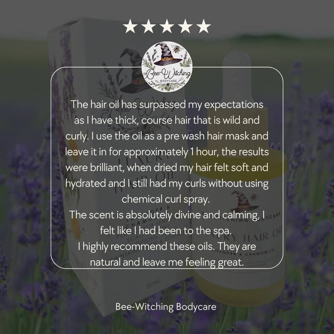 You will recieve a 30ml glass dropper bottle (for ease of application) of our luxury Lavender & Chamomile Hair Oil packaged in a beautiful presentation box.